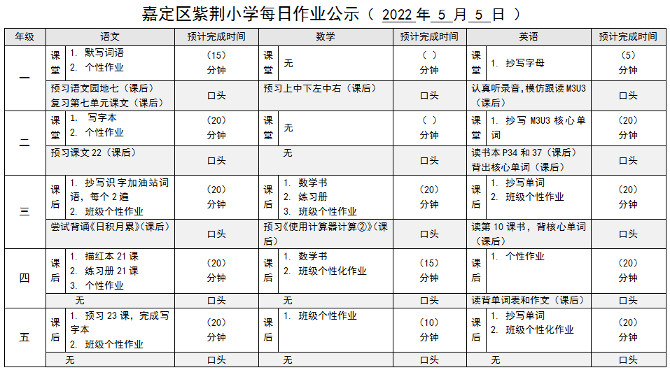 嘉定区紫荆小学每日作业公示( 2022年 5 月 5 日 )